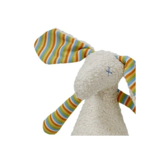 Avec ses grandes Oreilles pour capter les secrets, des grands pattes pour l’attraper et ne pas le lacher, et son petit bidoux, … ce lapin classic et tendance revue en couleurs avec ses rayures, rappelle les peluches d’autrefois. Un doudou simple et sans trop d’expressions pour laisser aux bambins l’initiative du jeu et de l’échange. Facile à saisir, à câliner, à secouer, ce beau doudou est le compagnon des touts petits… compagnon pour bébés heureux…