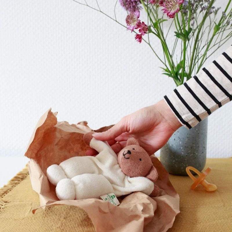 Pour les petits bébés écolo, et dès la naissance, Eveil, douceur & réconfort en compagnie de ce petit Doudou Hochet Nanchen® Natur Ours Brummel Coton Bio Eponge (Kba) Brun Ecru 18cm. Un doudou bio pour ‘bébé bio’ en tissu éponge de coton bio issu de l’agriculture biologique (certification Kba), rembourré à partir de laine bio de mouton (certification Kbt). Un doudou ourson premier âge, simple, doux et tendre dont les traits d’expression peint à la main, lui confère cette identité unique. Facile à saisir, à câliner et à mâchouiller grâce à ses petites, ses belles oreilles, notre Doudou plat Bio Lapin Brun et Écru, saura prendre soin de bébé, et lui apporter douceur et réconfort.