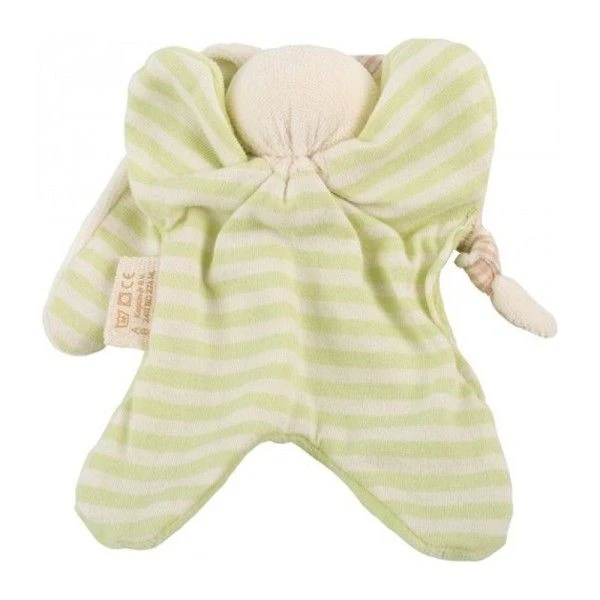 Pour les touts petits, Amour et réconfort auprès de ce Doudou en coton bio ‘Doudou Hochet Coton Bio Keptin-jr Little Toddel Vert’ 16cm , naturel et doux, dont la forme en ailes de papillon offre 4 prises parfaites en plus de ses 2 longues oreilles mi velours mi jersey vichy beige et écru, dont l’une est nouée… pour être mâchouillée. La face du doudou Toddel est unie en velours vert pâle, le dos dans un jersey rayé ecru et vert pâle…Un doudou écologique dont la conception favorise le développement de la filière bio et le rembourrage celle du recyclage. Un petit doudou trés doux, facile à saisir, pour se frotter et mâchouiller sans fin et accompagner bébé de partout, ensoleiller ses journées, adoucir ses nuits et consoler ses ‘petits bobos‘… ce doudou en coton bio Toddel sera de toutes les aventures.