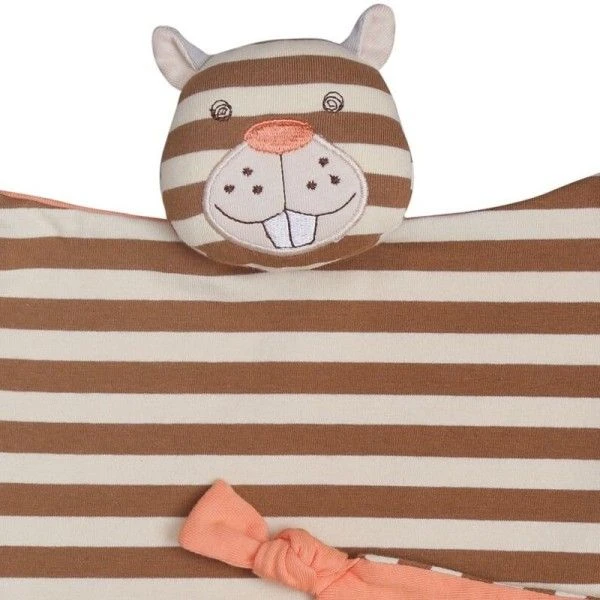 Pour les bébés bio, et dès la naissance, Eveil Physique, Jeux & réconfort avec ce Doudou Plat Carré Hochet Apple Park™ Castor ‘Biber’ 30 cm en Coton Bio. Un doudou mouchoir, plat et carré, dont les pattes sont de petits nœuds à mâchouiller, le ventre un doux jersey de coton bio rayé beige et marron, et le dos orangé, et bien sûr la sympathique bouille bien veillante de notre petit Castor travailleur est là pour rassurer bébé. Avec son air heureux, son large museau brodé laissant apparaître ce beau sourire, notre castor amusant et protecteur sera de toutes les aventures et pourra rassurer et consoler bébé le moment venu. Avec ce Doudou plat Organic Farm Buddies™, Bébé pourra se dégourdir les doigts, mâchouiller, découvrir les couleurs, les formes, et les câlins. La tête du doudou contient comme les hochets et la peluche assortie… un petit grelot discret.