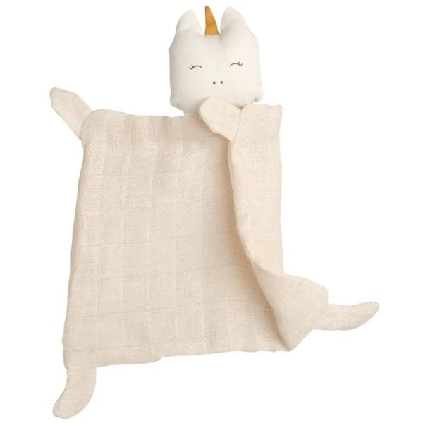 Les Doudous Plats Carrés Licorne Blanche & Miel Fabelab® Coton Bio GOTS se composent et sont:
