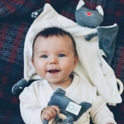 Hochet Attache Tétine & Anneau De Dentition Coton Bio & CaoutchoucÂne Paco Bleu Noukie’s® – Bébé Bio