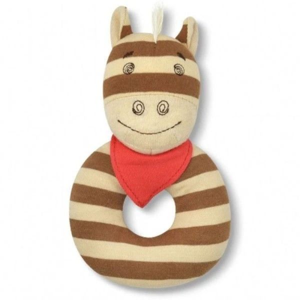Pour les bébés bio, et dès la naissance, Eveil Physique, Jeux & réconfort avec ce Hochet coton Bio Organic Farm Buddies™ Clyde le Poney Apple Park™. Un petit Hochet anneau en coton bio, rayé blanc écru /marron et surplombé de la bouille de notre cher petit poney Poncho, un poney souriant, coloré et très attachant avec son petit bandana noyé à l’encolure. Un hochet tout doux et bio pour passer de bons moments à aiguiser ses sens. Avec ce Hochet Organic Farm Buddies™, Bébé pourra se dégourdir les doigts, mâchouiller, découvrir les couleurs, les formes, ou le tintement de la clochette. Bien sur la sympathique et tendre bouille de notre Hochet Poney en coton bio est là pour encourager bébé… Un doudou Hochet Organic Farm Buddies™, amusant et protecteur pour accompagner bébé dans ses premiers moments de joie et de jeu. Un doudou coloré et déluré comme les petits amis de la gamme Organic Farm Buddies™ de chez Apple Park.