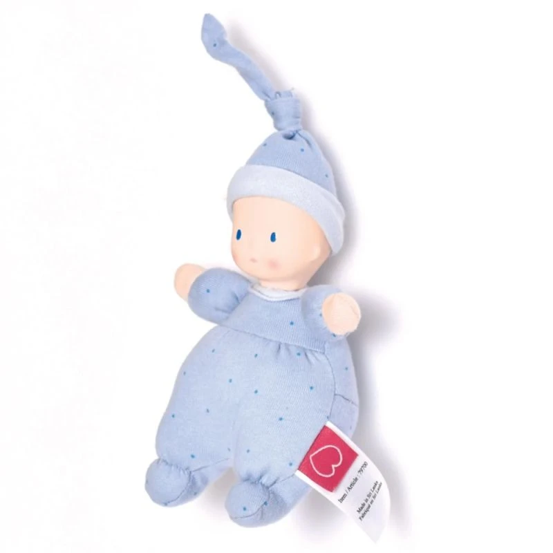 Les Poupées de chiffon premier âge bleue à pois 22 cm tête caoutchouc naturel Bonikka sont réalisés avec soin. Comme toutes les poupées de coton, et poupons coton -caoutchouc Bonikka®, elles sont fabriquées à la main, à partir de coton naturel et pour les modèles avec le tête en caoutchouc, il s’agit de caoutchouc naturel de l’arbre Hévéa issu de l‘Agriculture responsable.