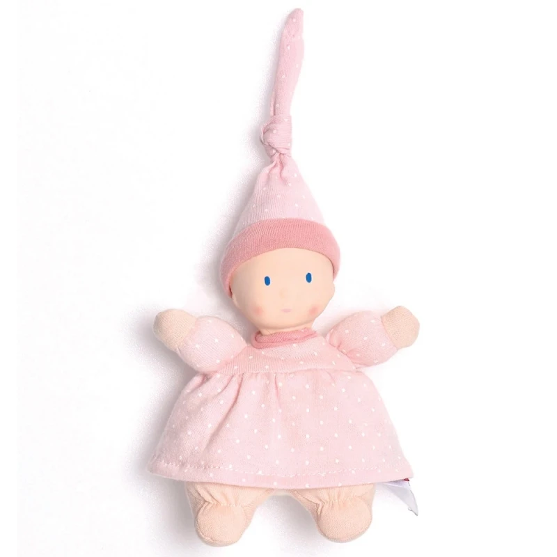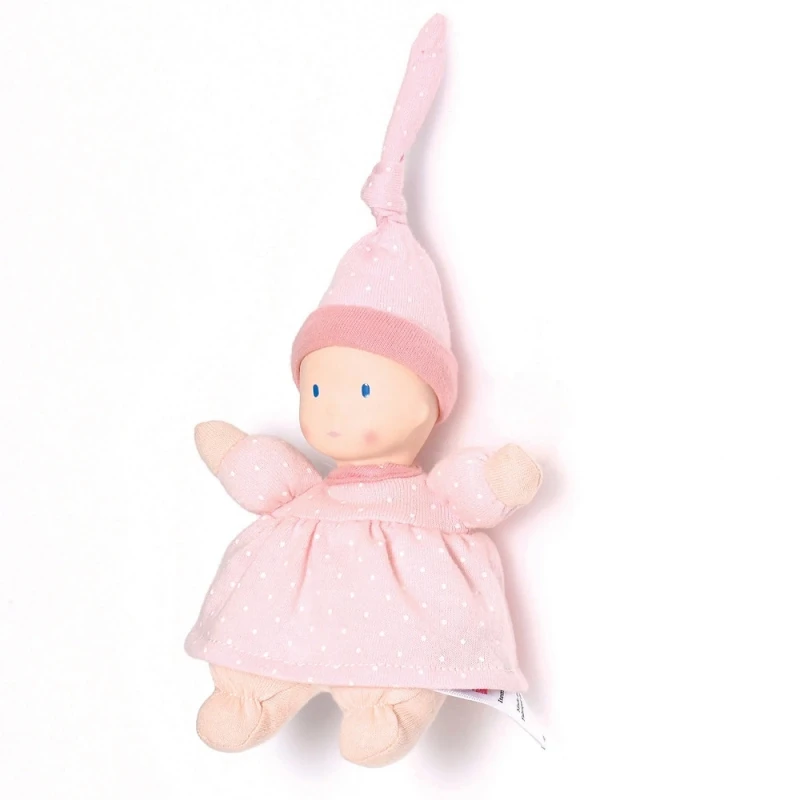 Pour les bébés bio et écolos dés les premiers mois, éveil confort et réconfort avec cette poupée de chiffons et caoutchouc couleur rose pâle, surplombé d’une adorable petite tête douce en caoutchouc naturel aux traits peu marqué pour s’accommoder de l’état quotidien de bébé. Une adorable première petite Poupée de chiffon premier âge Rose 22 cm tête caoutchouc naturel, robe et bonnet à pois blanc Bonikka . Une petite poupée premier âge tendre, saine et naturelle idéale pour accompagner bébé tout au long de la journée et pour adoucir ses moments difficiles. Fabriqué en coton et en caoutchouc Naturel issu d’une culture durable, ce jouet premier âge aux formes et textures douces permet à bébé de bien le saisir, de même que les différentes appendices offrent de quoi mâchouiller. Une poupée de coton et caoutchouc naturel, écologique, solide et durable qui saura résister aux jeux, aux léchages et mâchouillages et aux câlins nécessaires à la découverte du monde.