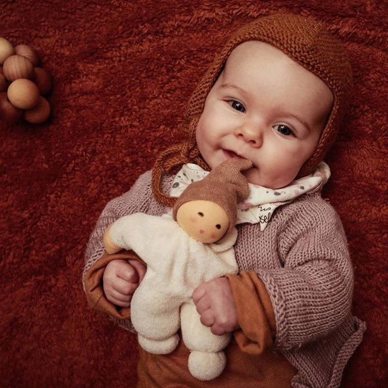 Pour les petits bébés écolo, et dès la naissance, Eveil, douceur & réconfort en compagnie de ce petit Poupon Waldorf 18cm Nanchen® Natur Nucki Coton Bio Eponge (Kba) Marron Ecru. Un doudou bio pour ‘bébé bio’ en tissu éponge de coton bio issu de l’agriculture biologique (certification Kba), rembourré à partir de laine bio de mouton (certification Kbt). Un doudou rondelet premier âge, simple, doux et tendre dont les traits d’expression peint à la main, lui confère cette identité unique. Facile à saisir, à câliner et à mâchouiller grâce à son petit bonnet et ses membres rondelets, notre Doudou poupon marron et écru, saura prendre soin de bébé, et lui apporter douceur et réconfort.